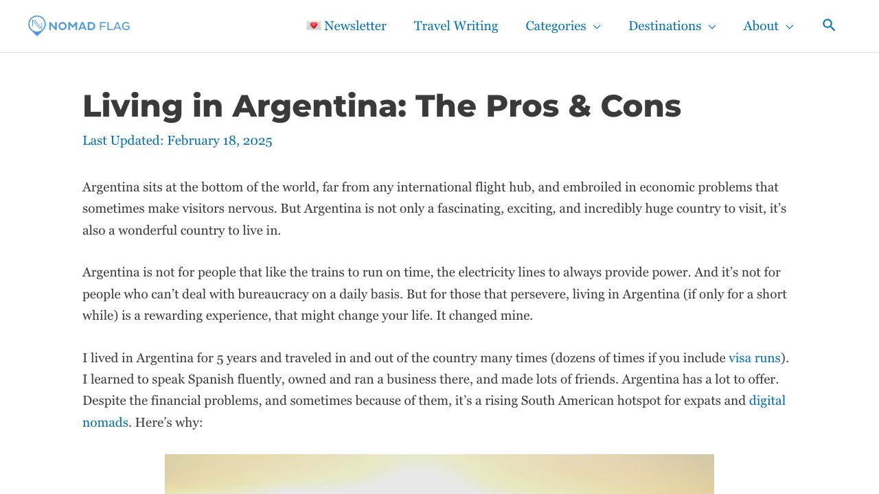 Nomad Flag is a resource for digital nomads and expats considering Argentina. The site features comprehensive guides on cost of living, visa options, and lifestyle comparisons. With detailed analysis of Buenos Aires as a nomad destination, it helps remote workers understand the practical realities of setting up base in Argentina.