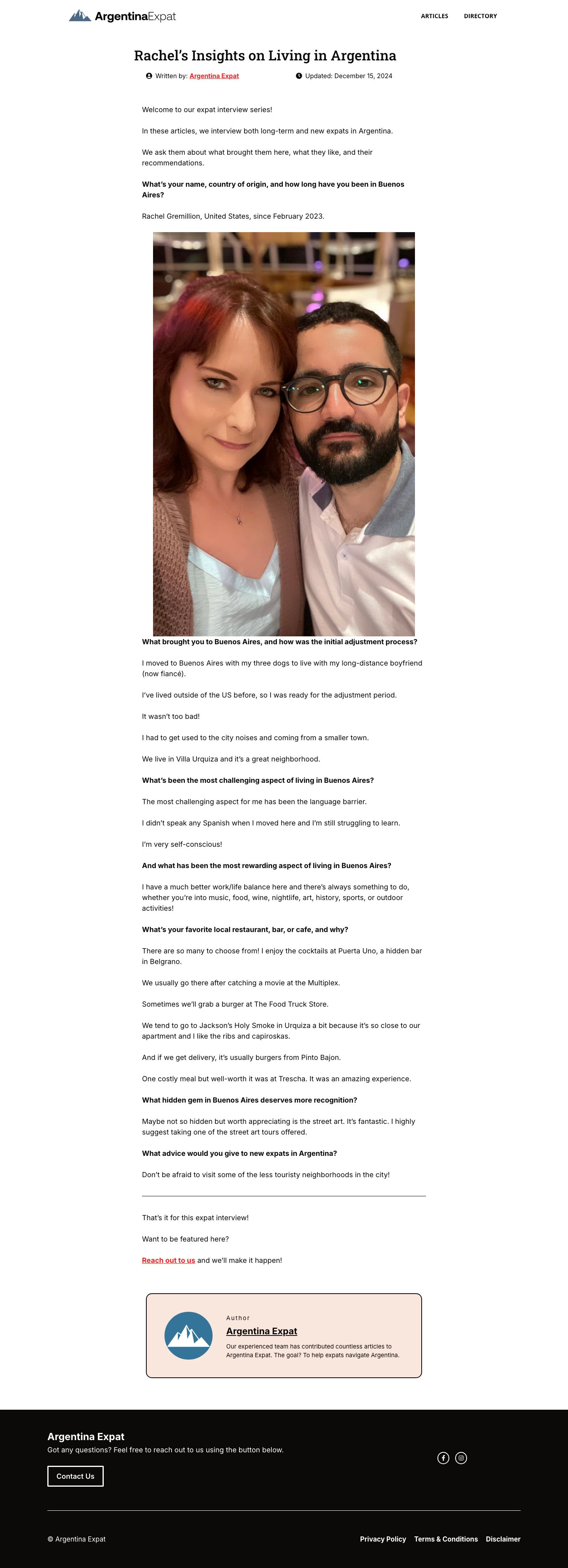 Rachel moved to Buenos Aires in February 2023 with her three dogs to be with her long-distance boyfriend (now fiancé). Living in Villa Urquiza, she shares practical insights for pet owners considering Argentina, her favorite hidden bars like Puerta Uno, and the challenges of learning Spanish. She's embraced the Argentine work-life balance and discovered fantastic street art tours and local neighborhoods beyond the tourist areas.
